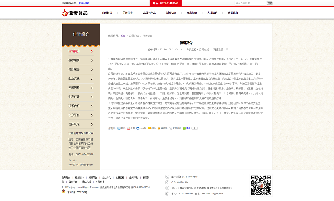 云南佳奇食品有限公司成立于2014年5月,坐落于云南省玉溪市素有“滇中水城”之称易门县,占地面积10亩,总投资1851.87万元,总建筑面积4296 平方米,其中:生产车间2425平方米、仓库(冷库)1000 多平米、办公楼300 平方米、其他辅助用房122 平方米,绿化面积1000 平方米。