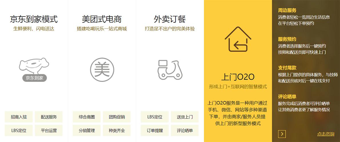 立即咨询O2O系统是一款线上-线下一体的O2O系统,涵盖外卖、团购、上门O2O服务、同城购物、餐饮酒店预订等综合性的本地生活服务O2O系统。 支持二次开发,全平台互通。全方位覆盖美团式电商、京东到家模式、外卖订餐、上门O2O等模式,一套系统,全渠道管理!